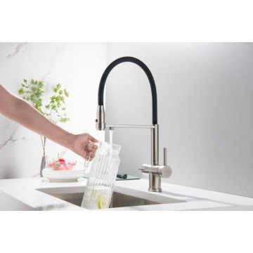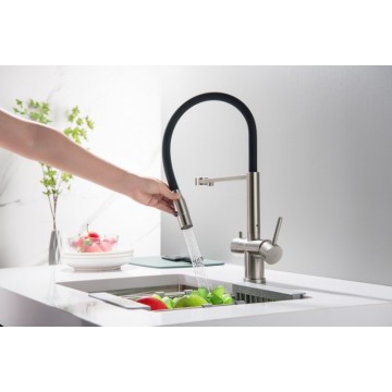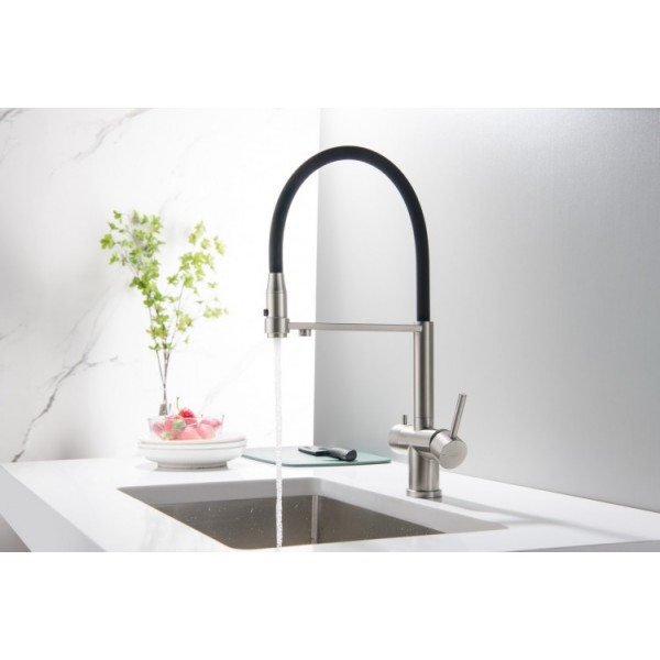 Franke Eos Neo pull-out spray w kolorze złotym jest to jeden z największych hitów wśród naszych klientów odwiedzających ekspozycję AGD. Bateria poza wykończeniem w kolorze złotym posiada funkcję prysznica oraz strumień laminarny ograniczający rozchlapywanie wody.